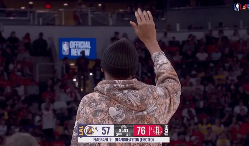 第三节比赛中,湖人内线德安德烈-艾顿犯规时打到阿尔佩伦-申京头部,裁判回看吹艾顿二级恶意直接驱逐。