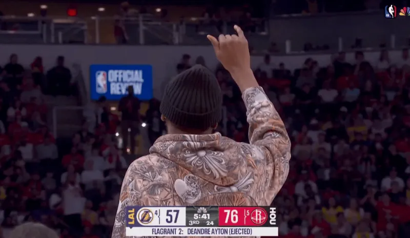 第三节比赛中,湖人内线德安德烈-艾顿犯规时打到阿尔佩伦-申京头部,裁判回看吹艾顿二级恶意直接驱逐。